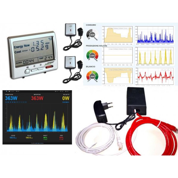 Proponiamo il nostro sistema di monitoraggio wireless EmonMCEE con MCEE USB con due trasmettitori di misura per rilevare i consumi dell’abitazione e la produzione fotovoltaica. Tramite il sito gratuito emoncms.eu è possibile visualizzare:
