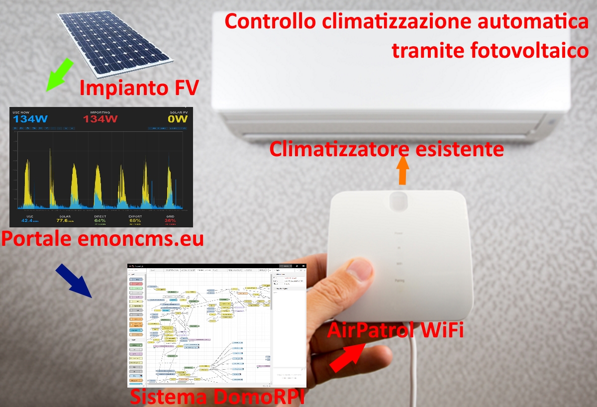 In particolare tramite l’unione di EmonMCEE, DomoRPI e un attuatore IR è possibile selezionare delle regole di attivazione delle pompe di calore quando l’impianto fotovoltaico immette energia al gestore elettrico, permettendo di minimizzare la svalutazione della produzione del proprio impianto e risparmiare sul riscaldamento dell’abitazione sfruttando la pompa di calore o delle stufe elettriche controllate automaticamente.
